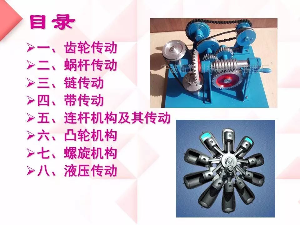 齿轮传动、蜗杆传动、链传动、带传动、连杆机构及其传动、凸轮机构、螺旋机构和液压传动八大机械传动知识培训PPT,绝对干货。